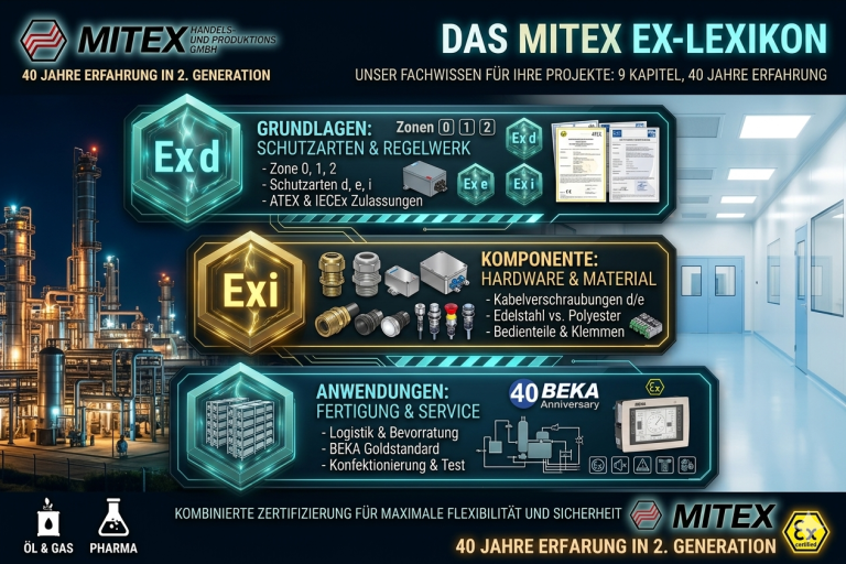 Das MITEX Ex-Lexikon: 40 Jahre Expertise kompakt gebündelt. Erfahren Sie alles über Zonen, Schutzarten (Ex d, e, i), Materialwahl und ATEX-Normen. Praxisnahes Wissen für Ihre Anlagensicherheit.