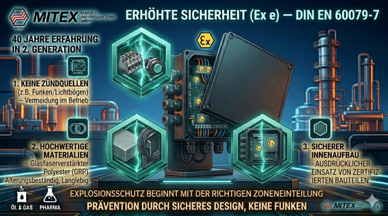 Warum MITEX? Mit 40 Jahren Erfahrung wissen wir genau, welche Kunststoff- oder Edelstahlgehäuse für Ihre spezifische Umgebung (z. B. Pharma oder Chemie) die richtige Wahl sind. Wir konfektionieren Ihre Ex-e-Verteiler individuell, normgerecht nach 60079-7 und anschlussfertig.